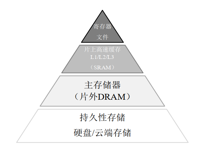 CPU 存储系统中广泛采用的层次化存储结构如上图所示,该结构呈现出典型的 “正三角”金字塔结构 。不同存储介质有着不同的存储特性: 顶部的存储介质离运算器近,速度快,但电路开销大,所以数量少,容量小;而底部的存储介质离运算器远,速度慢,但电路开销低,所以具有更大的容量。正是借助层次化的结构,通过合理的数据布局管理,为编程人员制造出存储系统容量又大速度又快的“假象”, 并在实际应用中成功地起到了加速数据访问的效果。