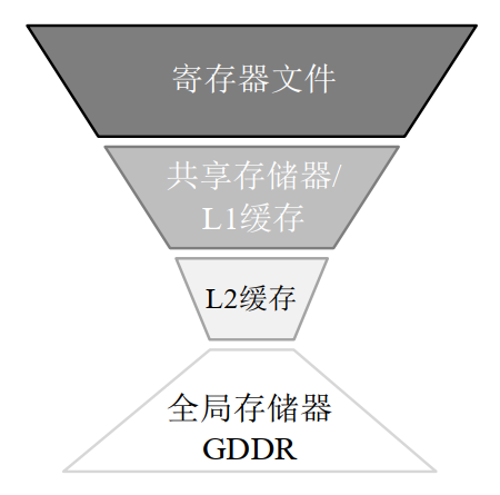 CUDA 和 OpenCL 的编程模型将 GPGPU 的存储大致分为寄存器文件、 L1 数据缓存/共享存储器、 L2 缓存和全局存储器等。 虽然各个层次与 CPU 中对应层次所采用的器件类型大体相同,但 GPGPU 中存储层次的设计与 CPU 却明显不同。 从上图中可以看到, GPGPU 每个可编程多处理器中寄存器文件的容量显著高于 L1 缓存和共享存储器,呈现出与 CPU 截然相反的“倒三角”结构,这种 “倒三角”结构 是 GPGPU 存储系统的一个显著特点。